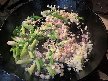 Add shredded cabbage, diced red onion, diced pepper, and sliced scallions with salt to taste, and cook over medium heat until soft, about 5 minutes.