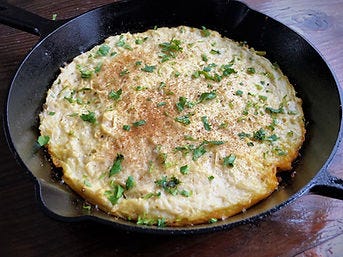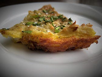 The resulting potato pancake is crispy on the bottom and sides, and creamy in the middle. The onion and cabbage crust is golden and spiced without much heat.